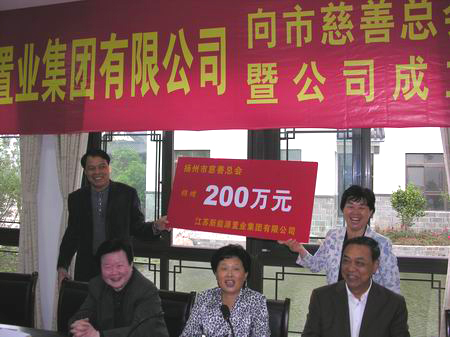 5月26日下午,集团公司在淮左郡中心会所举行隆重的捐资助学仪式,引起社会各界的极大关注。集团公司在十周年庆典之际,真情回报社会,向市慈善总会捐赠200万元,每年拿出10万元用于慈善事业,这是市慈善总会成立以来收到的最大的一笔民营企业捐赠款项。同时市慈善总会新能源助学基金也正式启动,该公司干部员工不忘贫困学生,当场捐赠49025元帮扶贫困学生完成学业,市慈善总会授予新能源董事长、总经理包广林先生为扬州市慈善总会副会长;称号。集团公司自96年成立以来成功开发了望月苑、咏月苑、得月苑、栖月苑、月亮园、新能源大厦和金鼎国际公寓,正在开发淮左郡庄园、金旺阁、公元国际大厦、奥都花城和杭集新隆商厦,累计竣工面积达到61.59万平米,实现销售额14.62亿元,入库税金1.2亿元,取得了经济效益和社会效益双丰收。