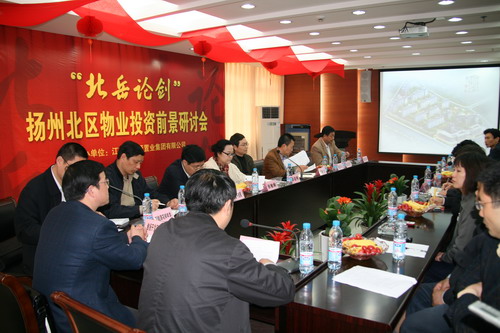 4月11日,由江苏新能源置业集团有限公司举办的扬州北区物业投资前景研讨会; 在公元国际大厦会议室隆重召开。江扬工业园管委会、维扬区建设局、维扬区规划局、维扬区商贸局领导,扬州大学房地产研究所、东南大学房地产研究所、中国房地产策划协会专家学者及江扬商贸城等北区相关在建项目负责人参加了此次会议。