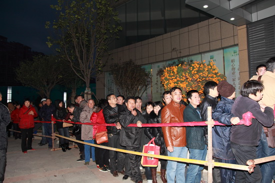 2013年11月12日,新能源水木清华二期最后一批房源11、18、19栋倾情巨献。一袭水木,一宅湖光,12000㎡中央湖景,礼献泰兴。开盘前夜,室外温度仅9℃,从凌晨一点起,便有客户前来排队,彻夜等待,只为早点签约到心中的好房,现场人气十分火爆,第一天就成功签约130余套。