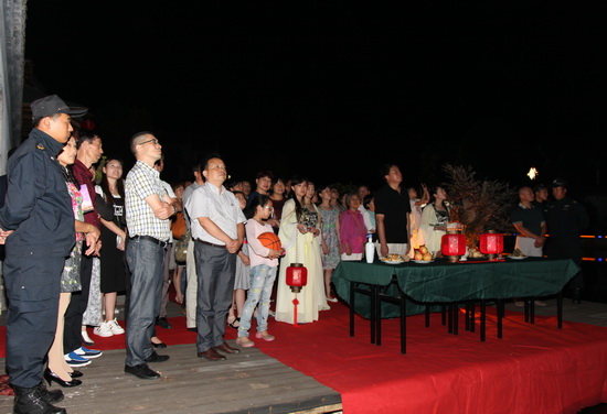 晚上8点,拜月仪式将整个活动推向了高潮。此时此刻,灯光关闭,在碧净如洗的夜空下,一轮圆月朗照豪第坊,众人肃立于香案之前,在优雅的乐声中,行礼如仪,默默许下心愿:祝愿祖国,繁荣富强;扬州城庆,日新日昌;万家亲朋,愉悦和祥。礼成后华灯再放,喷泉开启,欢乐祥和之境充满人间。