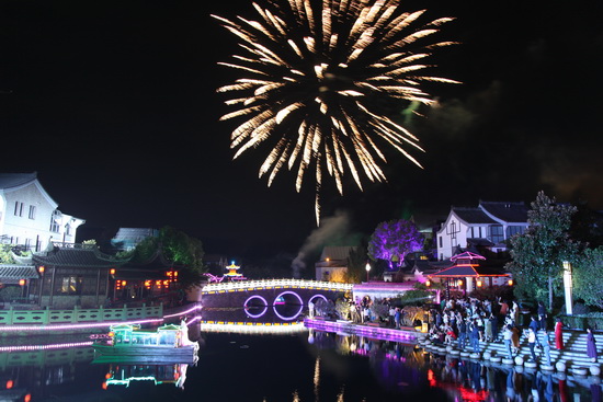 中秋节的豪第坊.扬州院子一片欢声笑语,装饰一新的各种彩灯为节日的夜晚增添了喜庆的气氛,大红的中国结分布在树上、桥梁、路旁,祝愿新能源业主的生活红红火火。